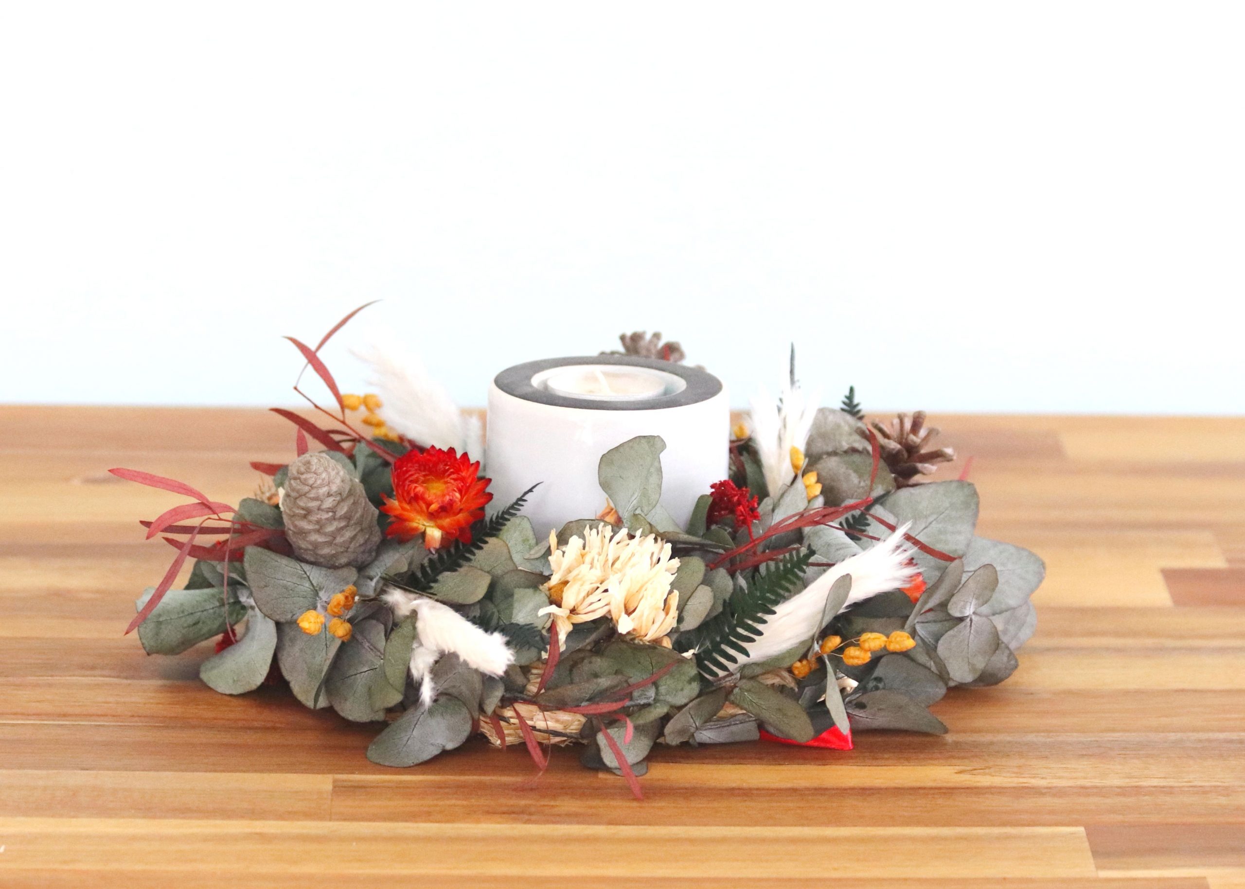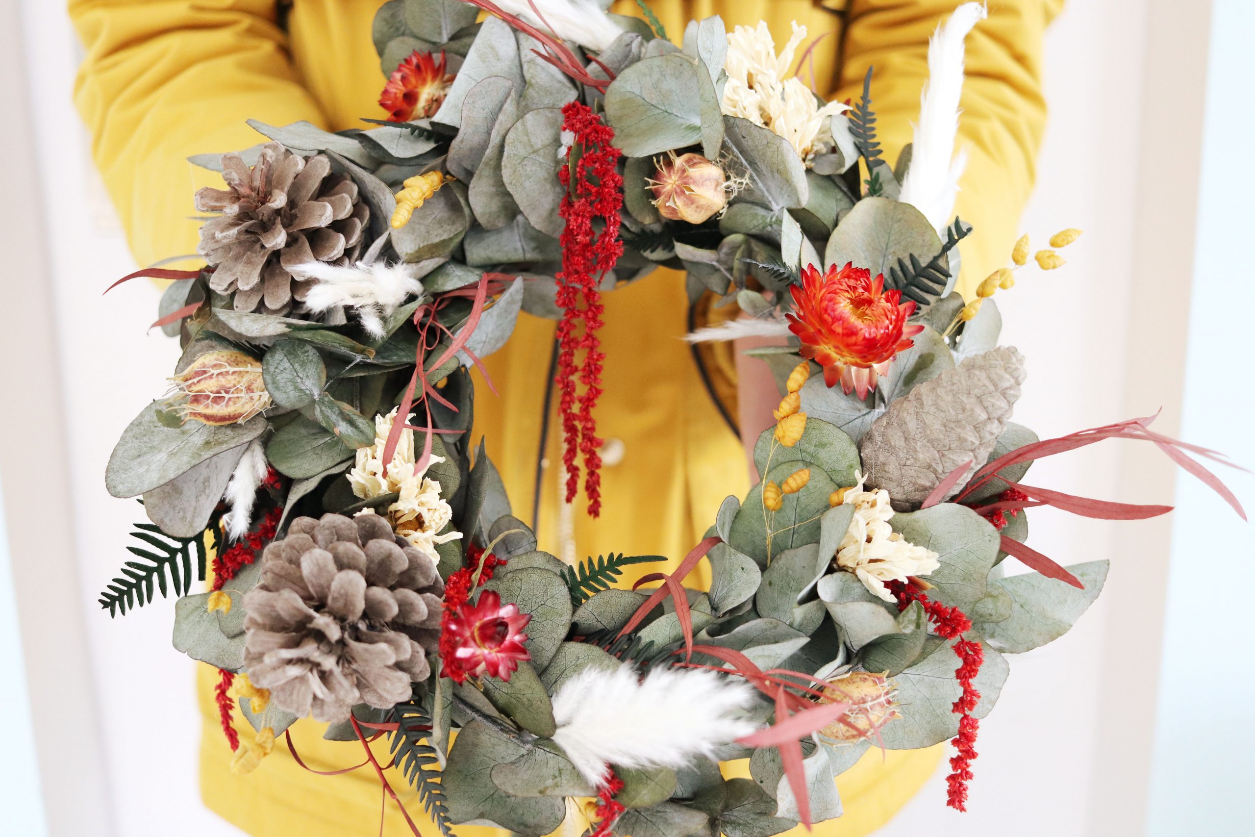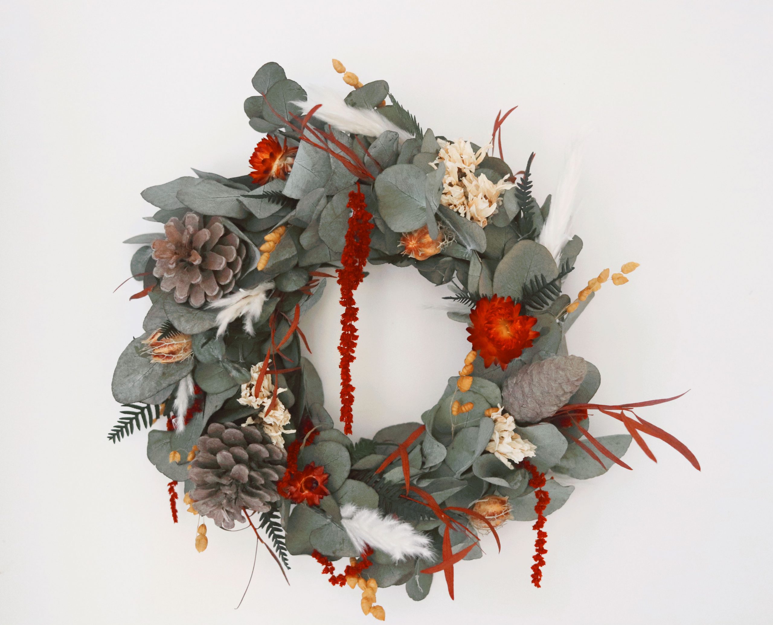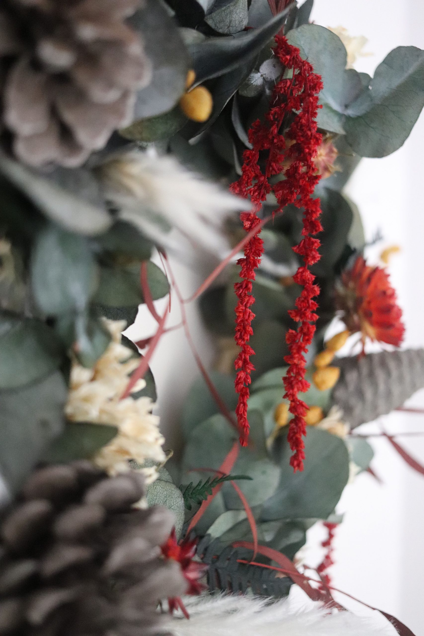 Composición hecha con flores preservadas y toques naturales de piñas. Se realiza artesanalmente con una variada gama única de flores para cada diseño.