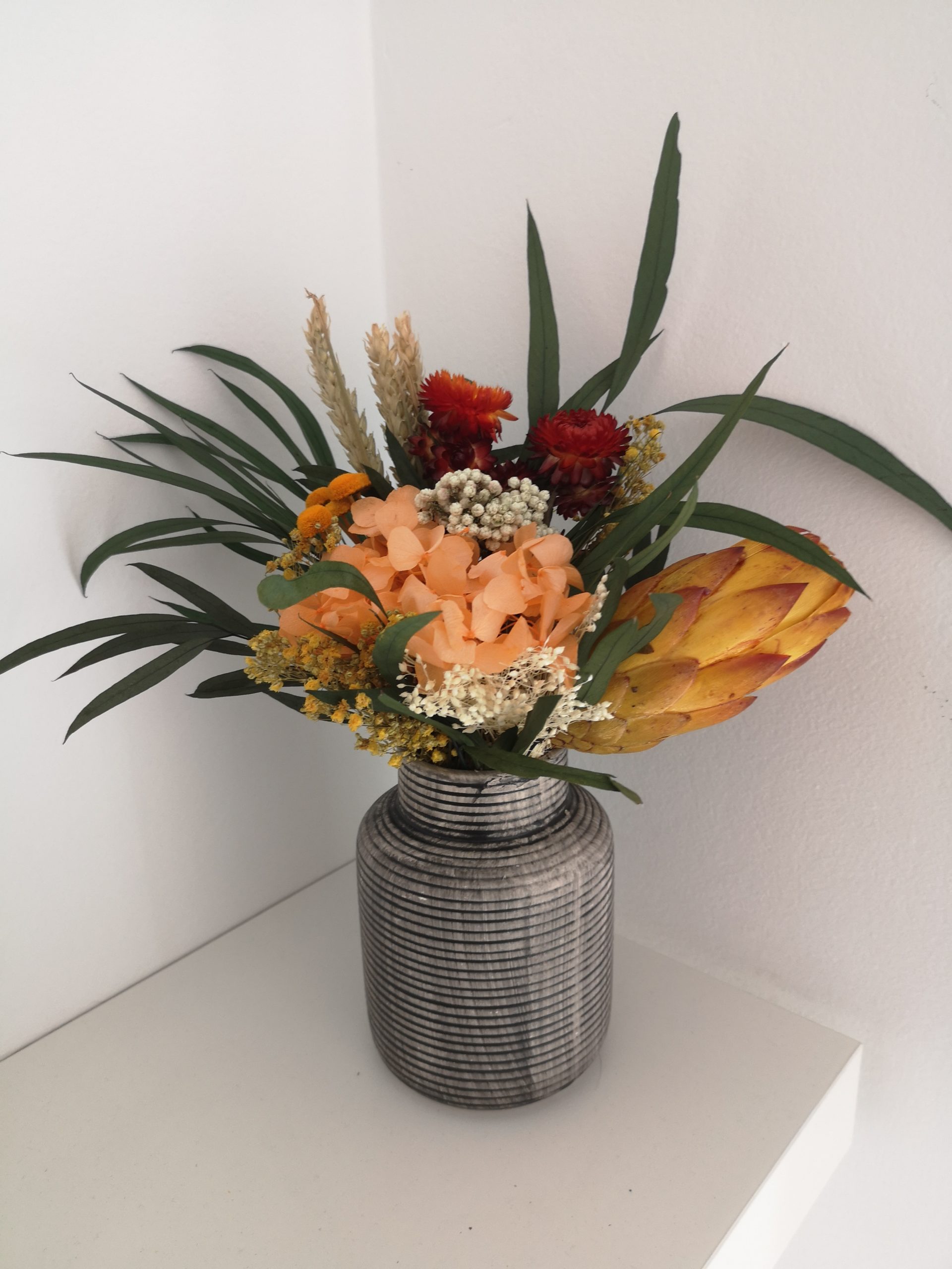 Composición hecha con flores preservadas en tonos rojos y naranjas con algún toque de amarillo. Se realiza artesanalmente con una variada gama única de flores para cada diseño.