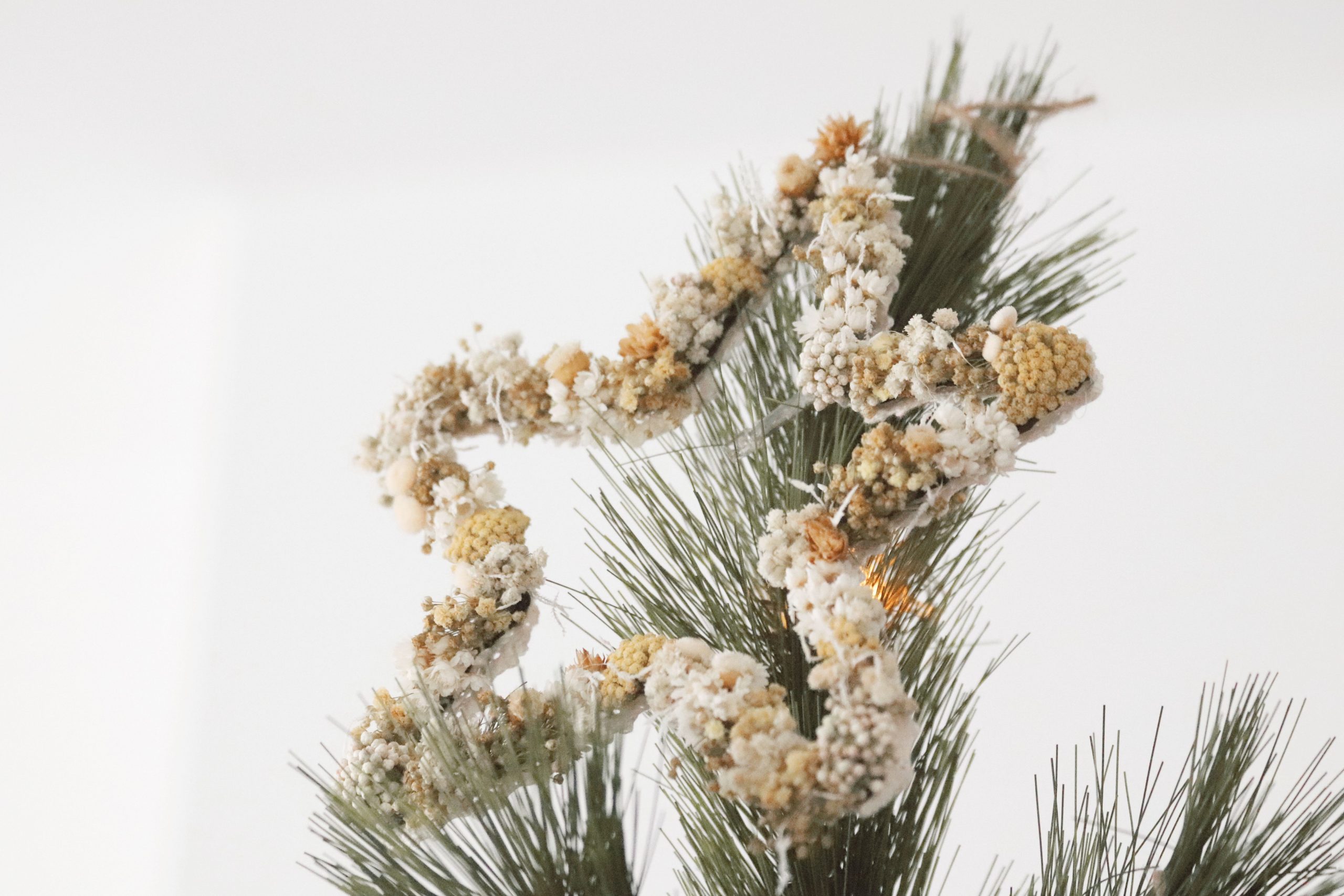 Composición hecha con flores preservadas en tono blanco y beige con algún toque de amarillo. Se realiza artesanalmente con una variada gama única de flores para cada diseño.