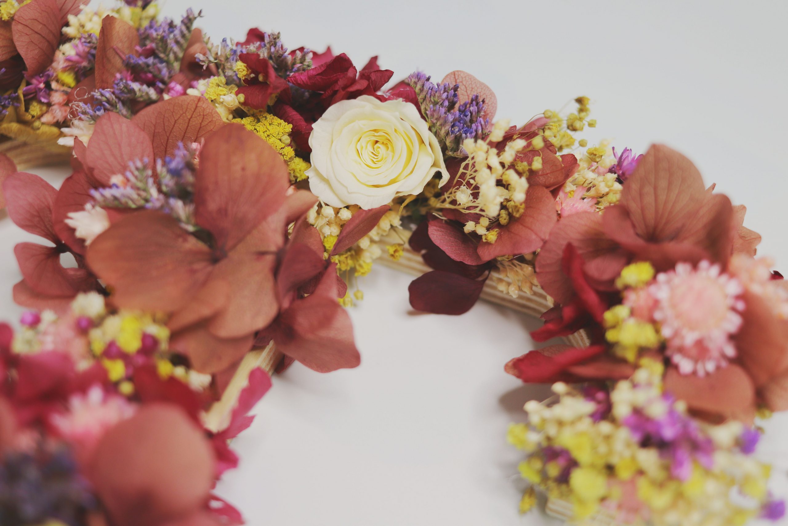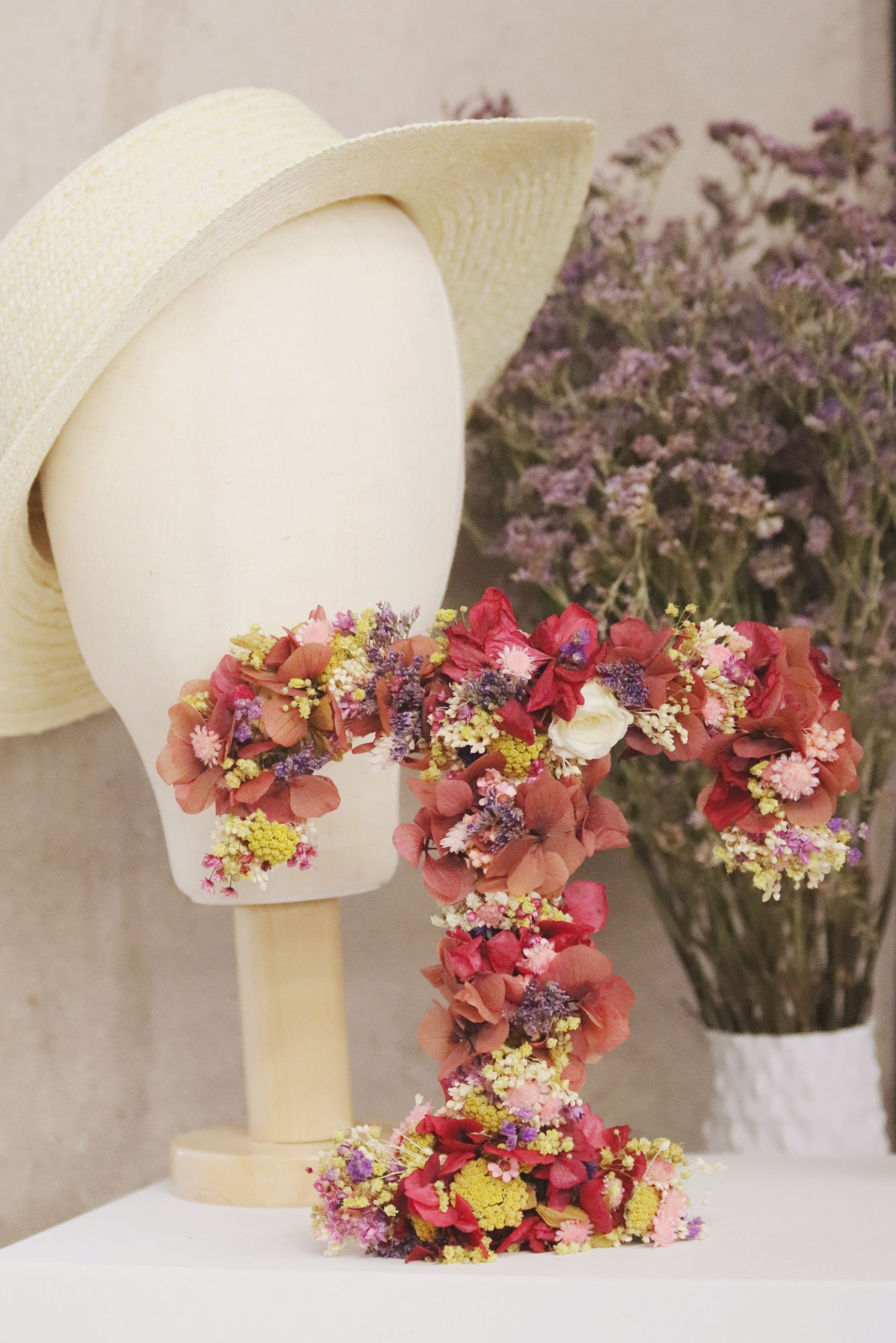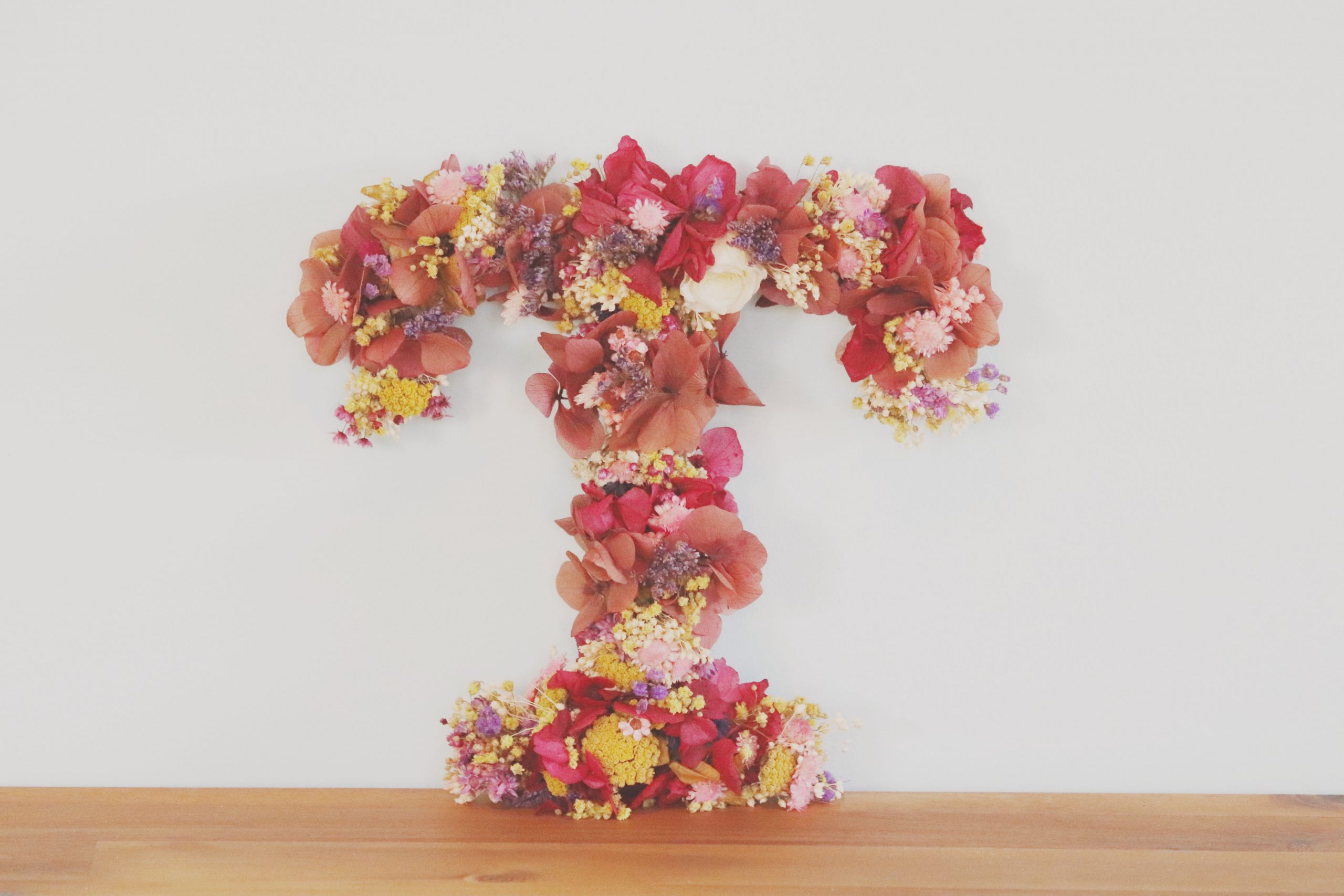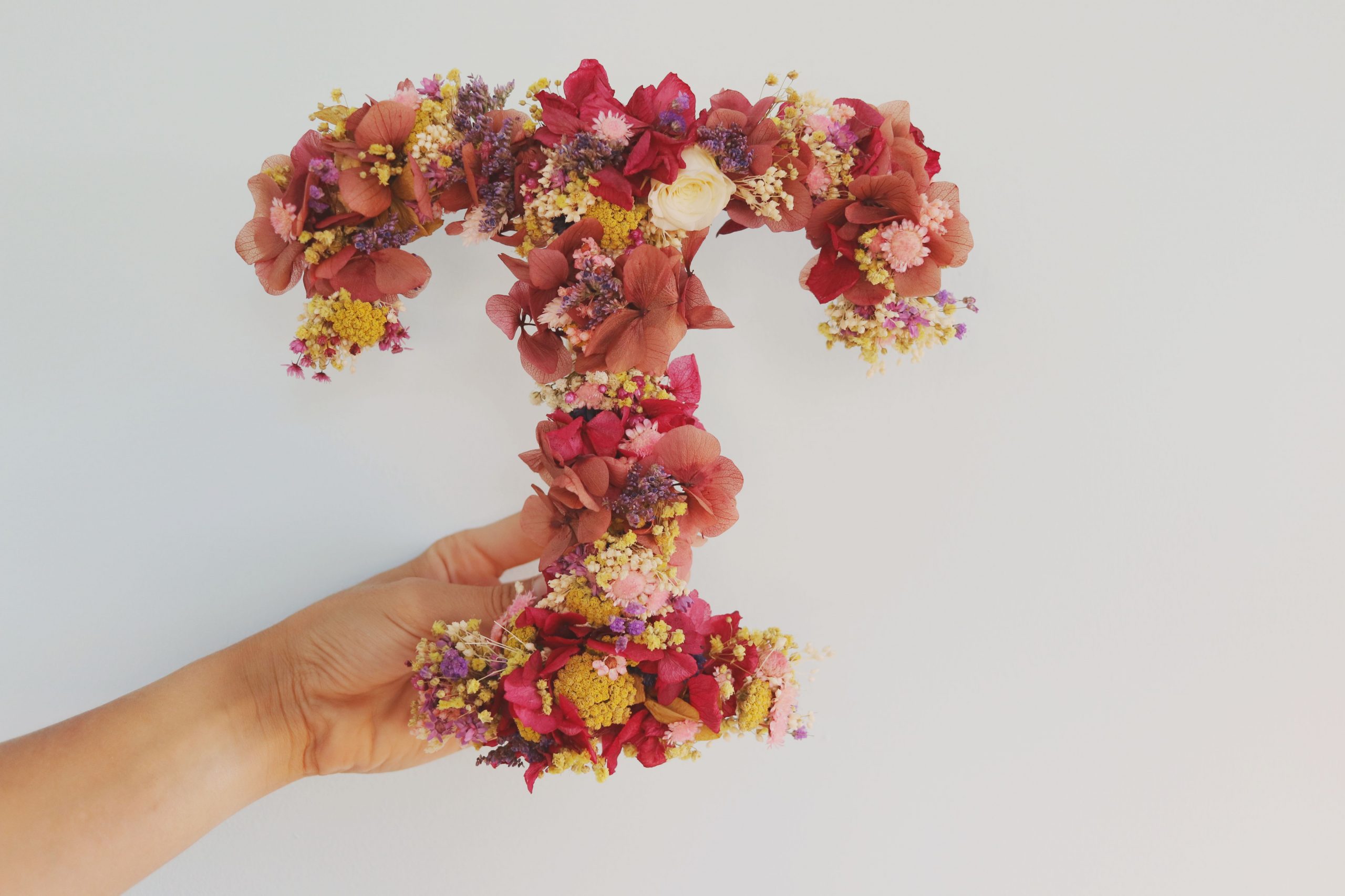 Preciosa inicial de madera con flores preservadas en tonos fucsias, amarillos con algún toque morado. Se realiza artesanalmente con una variada gama única para cada diseño.