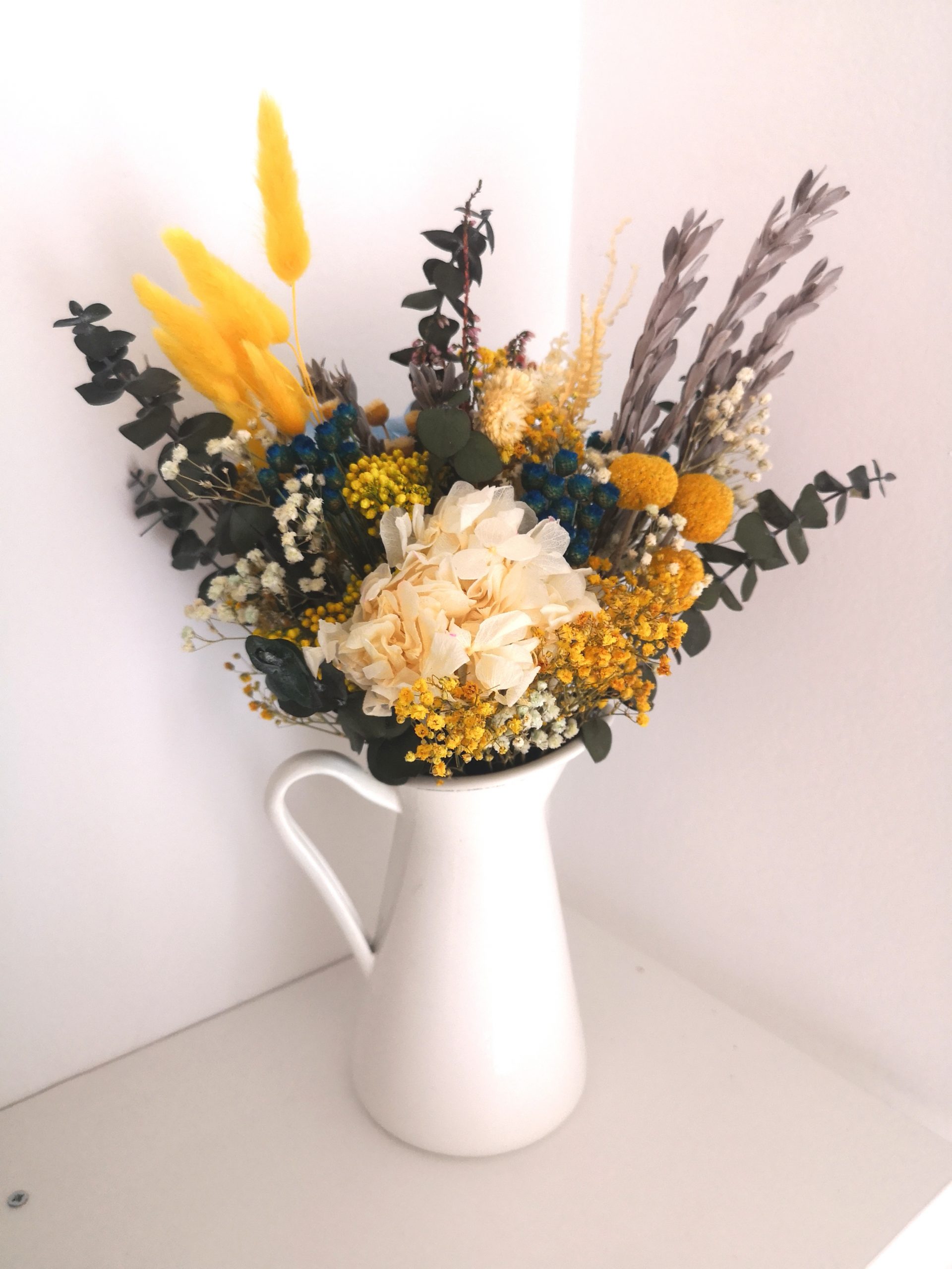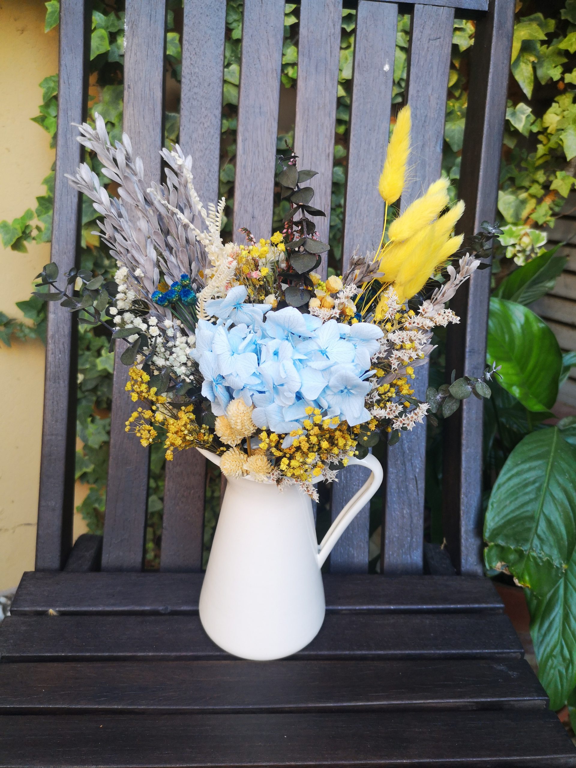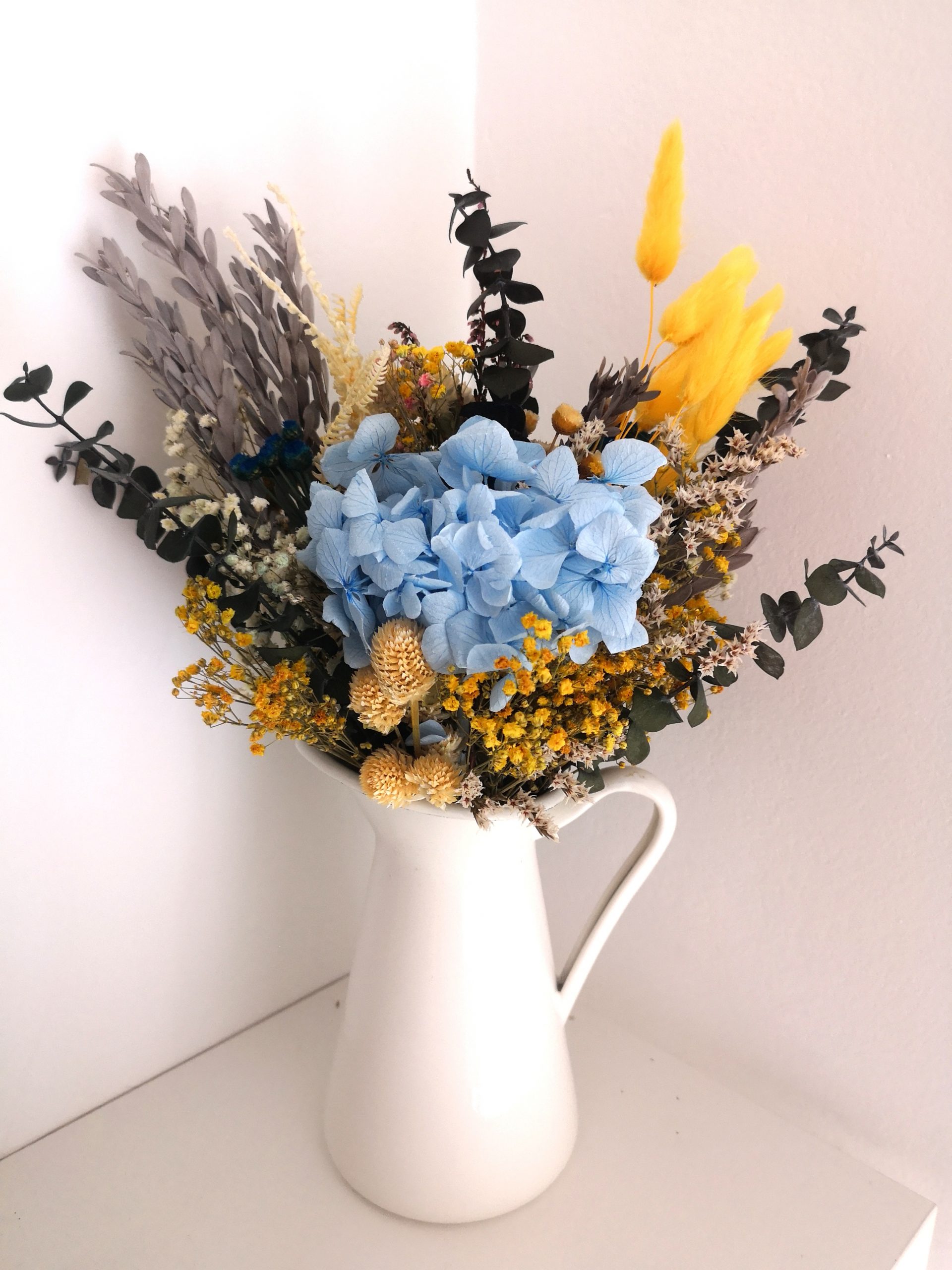 Composición hecha con flores preservadas en tonos azules y amarillos. Se realiza artesanalmente con una variada gama única de flores para cada diseño.