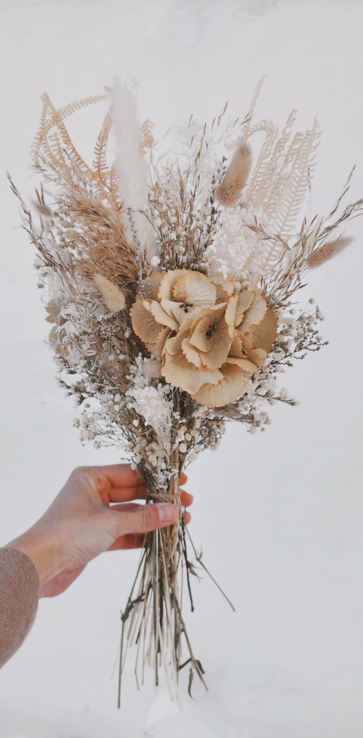 Ramito en tonos neutros, muy elegante pero a la vez sencillo. Colores que transmiten calma y tranquilidad. Si tienes pensado este ramito como regalo para alguien especial, seguro que le encantará.